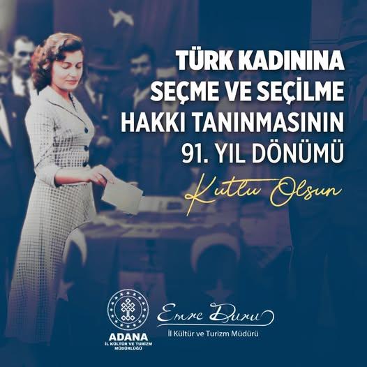 Türk kadınına seçme ve seçilme hakkı tanınmasının 91. yıl dönümünü kutluyor, bu anlamlı günü kadınların toplumsal hayattaki güçlü varlığına bir kez daha dikkat ç